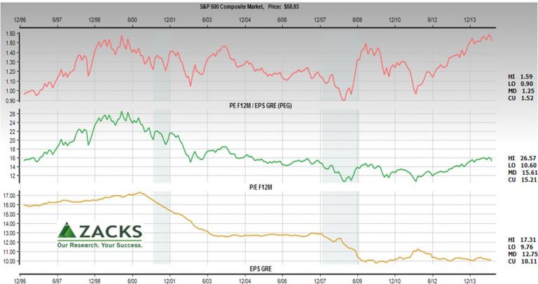 In Market value – why P/E might not be what you think it is (May, 2014), limitations of the P/E were noted. Zacks Research System provides a comparison of P/E ratio to the Price/Earnings to Growth (PEG) ratio. The PEG ratio divides P/E by analyst estimates of 3-5 year EPS growth rate. To the extent that analyst’s estimates of 3-5 year EPS growth rate are reduced, the PEG is higher than the P/E. This is because the P/E assumes no EPS growth rate changes over time. PEG is currently just below all-time highs.