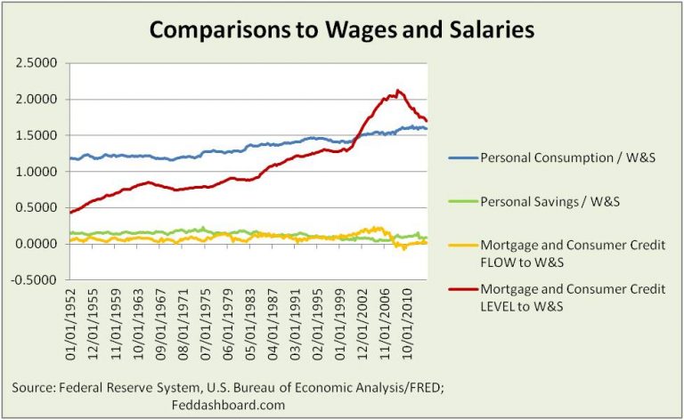 This picture compares debt, savings and spending to wages and salaries.
