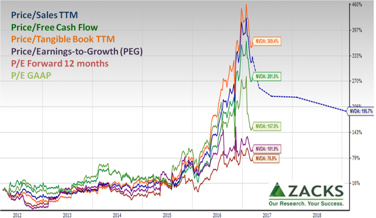Nvidia rocketed to a roughly 330% price increase over the past year (over 600% over five years). What fundamental is supporting it? The price has not been justified by tangible book as that measure is sky high. By contrast, price is most supported by Zacks-surveyed analyst expectations of forward twelve month earnings. The P/E to growth ratio (PEG) being higher than forward P/E means expected growth in earnings isn’t expected to persist for five years by the five analysts who sent estimates to Zacks. Will the source of earnings growth be cost-cutting or sales? The falling expected price-to-sales (P/S) ratio (dotted line) indicates that sales growth will be a significant contributor, but far from not all.