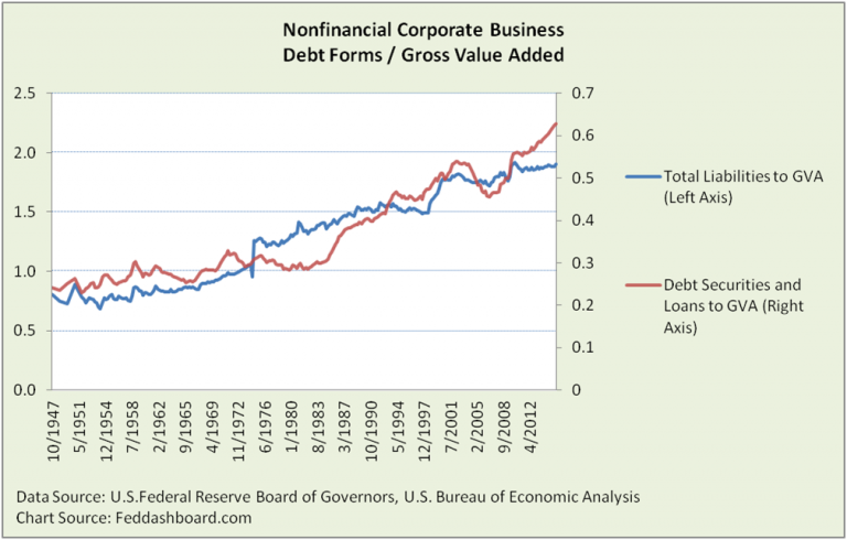 201604debtgdpsectorYet, the nonfinancial corporate business cycle blurs a bit when the ratio is crunched as Total Liabilities divided by Gross Value Added (GVA). Total Liabilities adds trade and taxes payables, Foreign Direct Investments in U.S. corporations, pension obligations and more. GVA for all business combined is a measure of output, roughly sales less inventory.