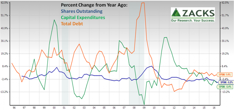 For S&P500 member companies (using Zacks Research System (ZRS) to provide an “apples-to-apples” historical view), we can see the percentage change from a year ago in shares outstanding, total debt and cap ex.