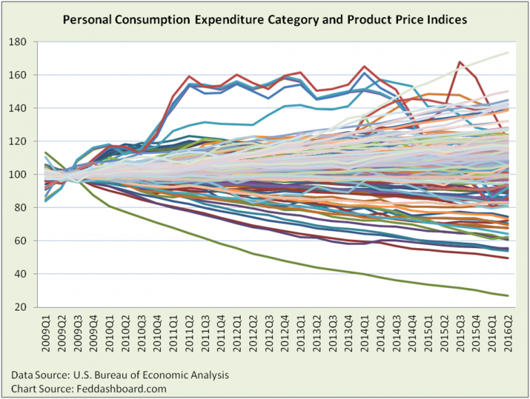 - It’s not a clear average, it’s a fan. “Core,” “trimmed mean,” “sticky” and other averages that remove a few outliers can’t portray the reality that there hasn’t been much of a central tendency to prices in decades. Why? Averages aren’t designed to show dispersion. Dispersion is easily seen below in a plot of the product categories reported by the U.S. Bureau of Economic Analysis (BEA). Starting at the index base year (2009=100), prices fan out.