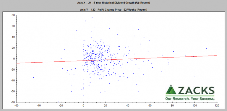The first two are 5 year historical dividend growth and 52 week percentage price change relative to the S&P 500. These are easily viewed in the Screener of Zacks Research System (ZRS). The blue dots are S&P 500 member companies.